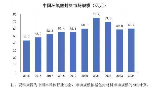 环氧塑封料行业作为半导体产业链中的关键支撑性行业,其发展趋势与半导体行业、半导体材料行业整体保持一致。根据《中国半导体支撑业发展状况报告(2024年编)》,2015-2021年,中国环氧塑封料市场规模呈现稳定增长态势,从2015年的43.7亿元增长至2021年的75.2亿元,年均复合增长率为9.5%。2022年和2023年,半导体行业终端需求整体有所缩减,导致环氧塑封料市场规模同步下滑;2024年,环氧塑封料行业开始触底反弹,当年中国环氧塑封料市场规模约为60.2亿元,同比增长2.0%。SIA、WSTS和SEMI等权威机构均预测全球半导体行业和半导体材料行业将继续增长,预计未来环氧塑封料行业也将保持增长态势。