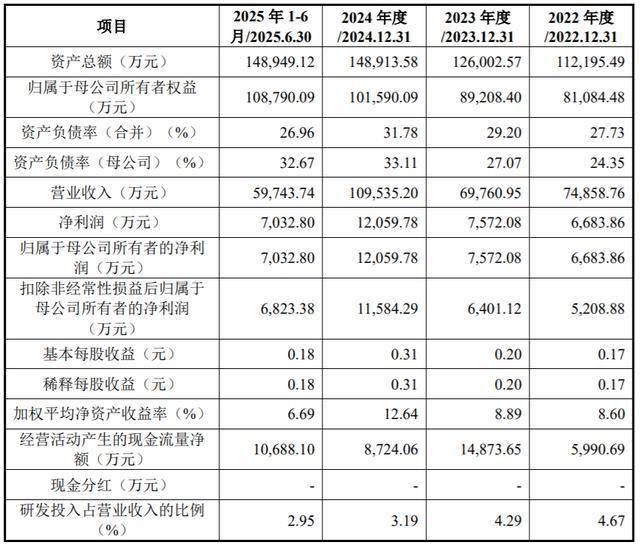 2022年至2024年及2025年上半年(报告期内),宇隆科技营业收入分别为7.49亿元、6.98亿元、10.95亿元和5.97亿元,归属于母公司所有者的净利润分别为6683.86万元、7572.08万元、1.21亿元和7032.80万元。