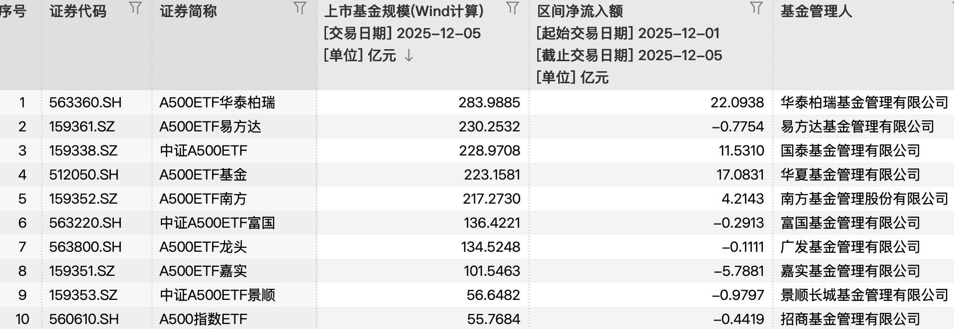 临近年末,中证A500主题ETF在12月首周(12月1日至5日)掀起了新一轮“吸金”热潮。