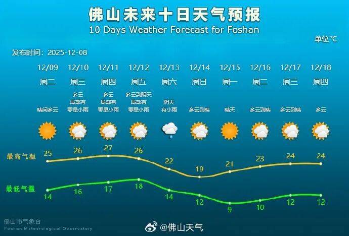12月9日,粤西和珠江三角洲中南部市县多云间阴天,局部有零星小雨,其余市县晴到多云。广东部分市县早晚有轻雾或雾。最低气温:粤北和珠江三角洲北部市县8~11℃,南部沿海市县15~18℃,其余市县11~14℃。