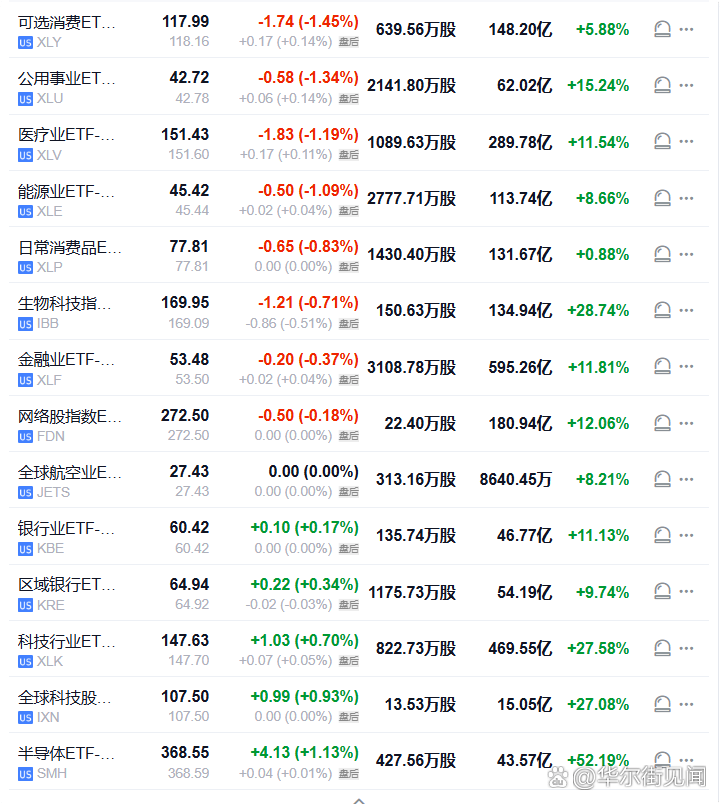 【可选消费ETF收跌超1.4%,领跌美股行业ETF,半导体ETF涨超1.1%】周一(12月8日),可选消费ETF收跌1.45%,能源业ETF跌1.09%,网络股指数ETF跌0.18%,区域银行ETF则收涨0.34%,科技行业ETF涨0.70%,全球科技股指数ETF涨0.93%,半导体ETF涨1.13%。