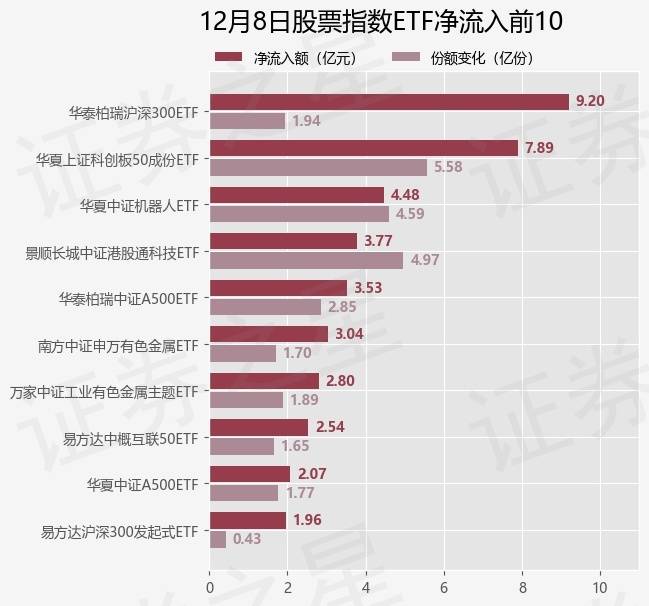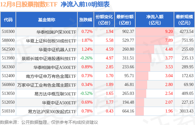 当日有172只股票指数ETF基金出现资金净流入,其中净流入排首位的是华泰柏瑞沪深300ETF(510300),份额增加了1.94亿份,净流入额为9.2亿元。