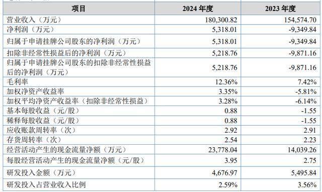 业绩方面,2023年、2024年,公司的营业收入分别为15.46亿元和18.03亿元,归母净利润分别为-9349.84万元和5318.01万元。