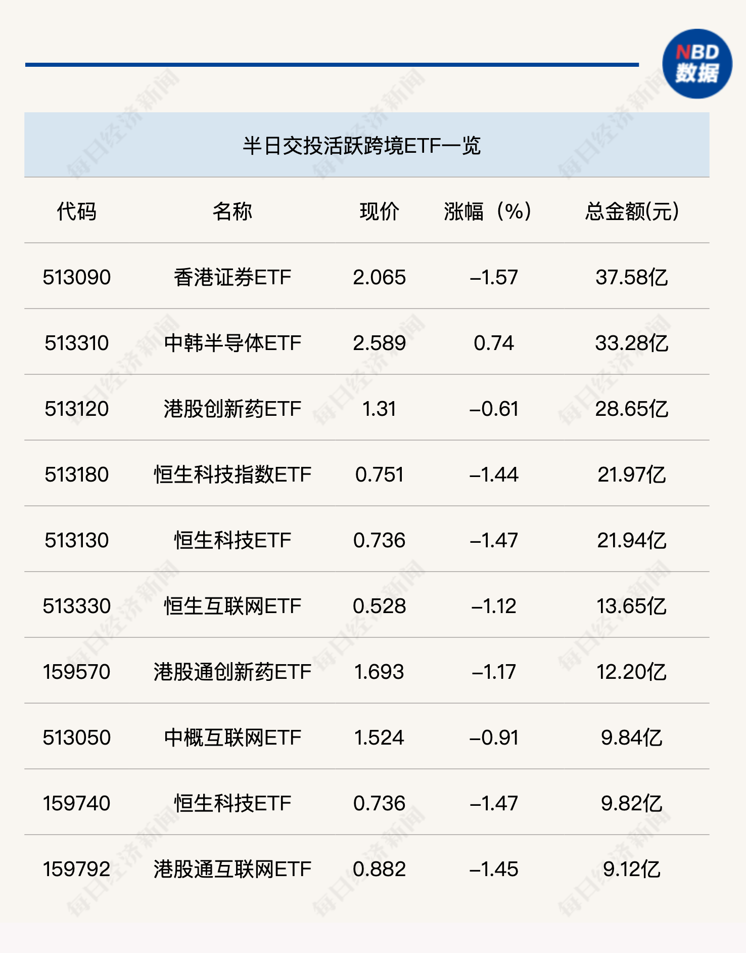 今日上午,通信和金融相关ETF交投相对活跃。其中,通信ETF(515880)半日成交金额达到13.3亿元,证券ETF(512880)、券商ETF(512000)以及银行ETF(512800)半日成交金额近10亿元。跨境ETF方面,香港证券ETF半日成交金额为37.58亿元,成交金额环比大幅萎缩。