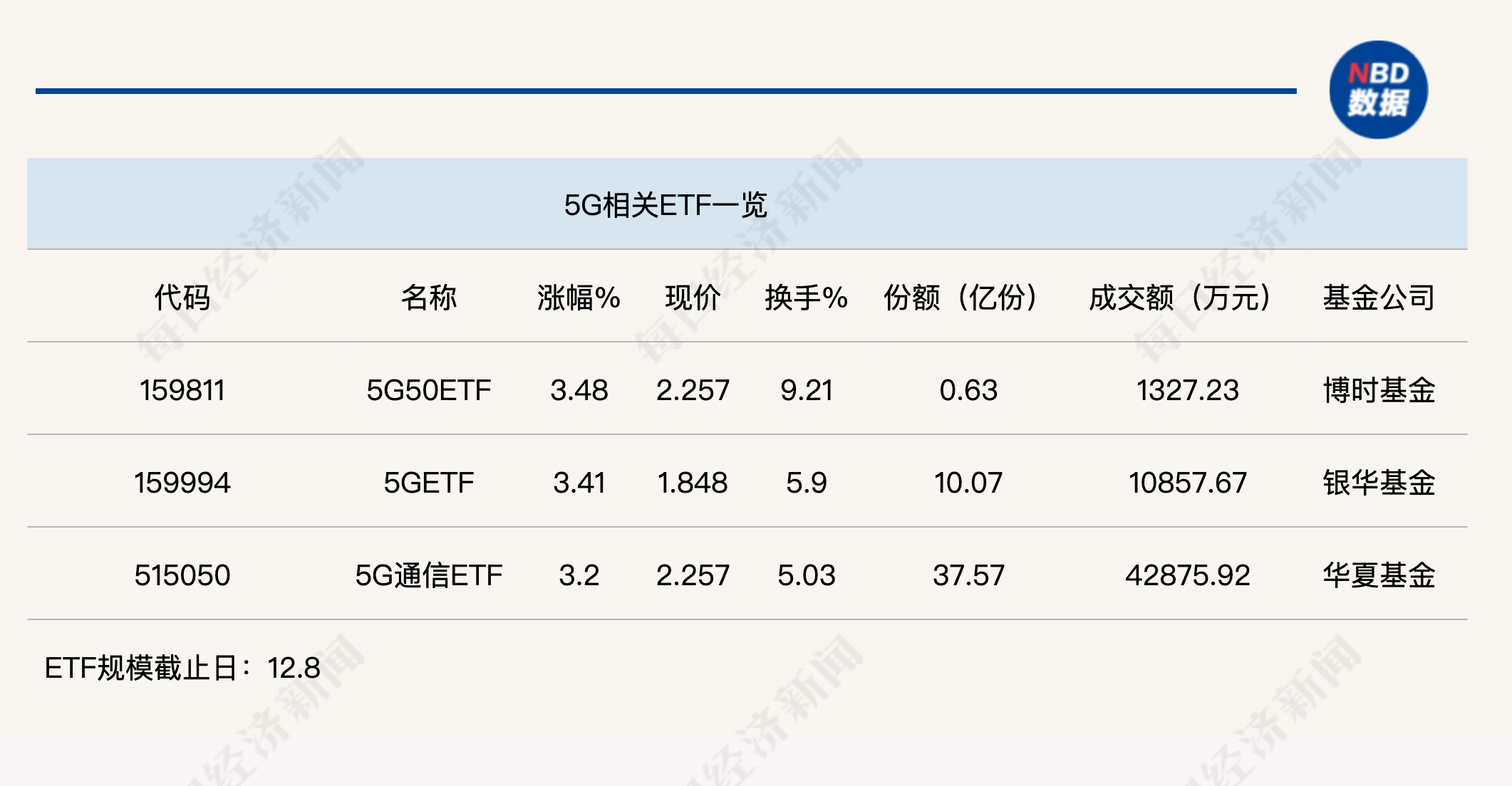点评:5GETF(159994)和5G通信ETF(515050)今日上午分别上涨3.41%和3.2%。其中,5G通信ETF(515050)份额达到37.57亿份,半日成交金额为4.29亿元。上述两只ETF追踪的是中证5G通信主题指数。