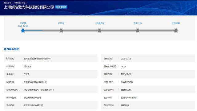 12月8日,上交所官网显示,上海频准激光科技股份有限公司(简称“频准激光”)科创板IPO获得受理,保荐机构为中信建投证券股份有限公司。