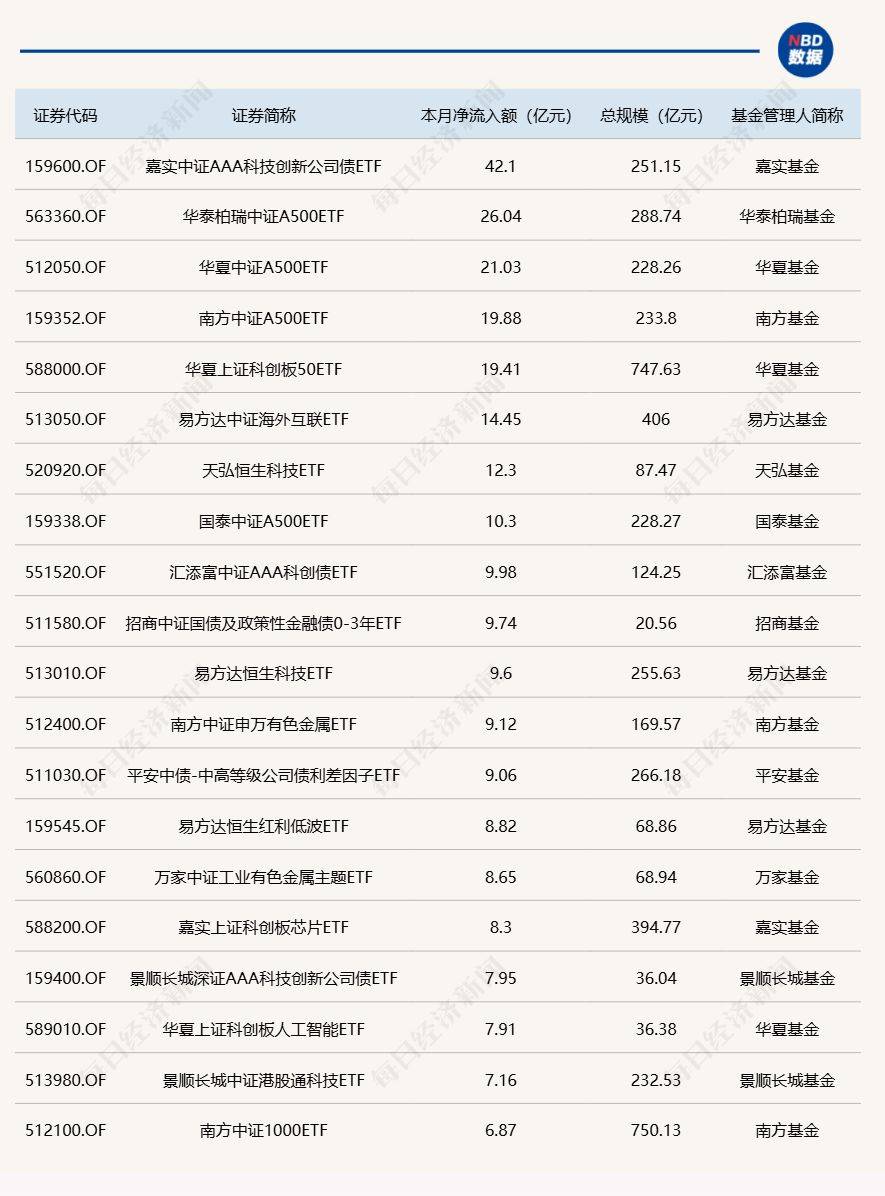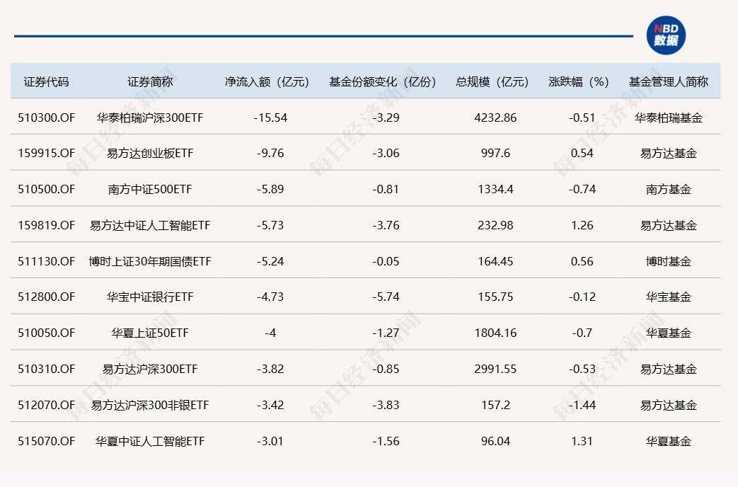 与此同时,华泰柏瑞沪深300ETF份额减少3.29亿份,对应净流出15.54亿元;易方达创业板ETF份额减少3.06亿份,录得净流出9.76亿元;南方中证500ETF份额减少0.81亿份,出现净流出5.89亿元。