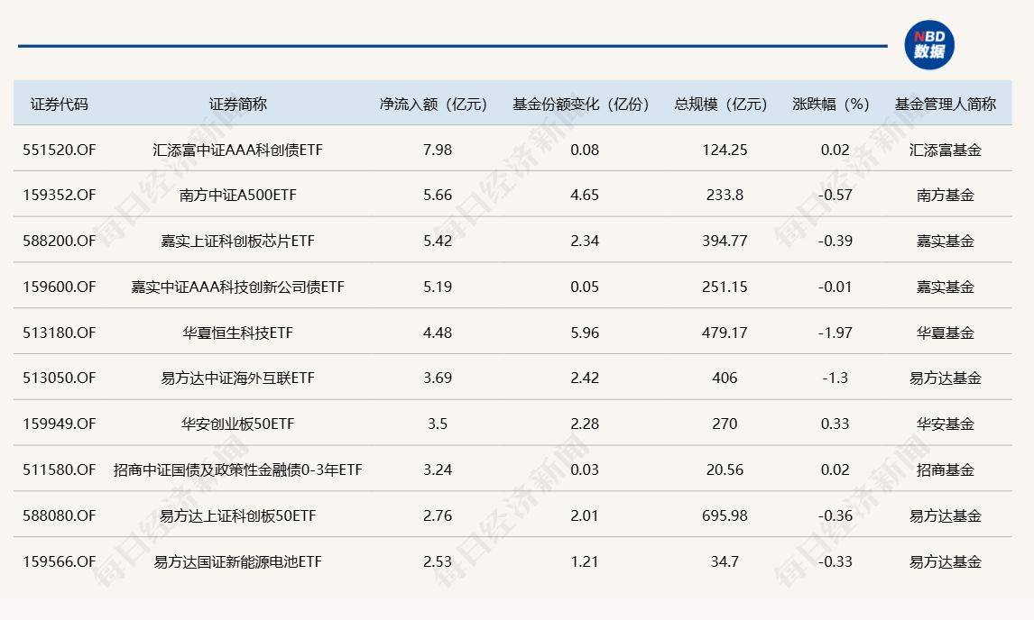 Wind数据显示,在12月9日的非货币ETF市场中,汇添富中证AAA科创债ETF份额增加0.08亿份,实现净流入7.98亿元;南方中证A500ETF增加4.65亿份,对应净流入5.66亿元;嘉实上证科创板芯片ETF份额增加2.34亿份,带来净流入5.42亿元。
