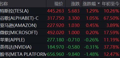 大型科技股表现分化,万得美国科技七巨头指数微涨0.14%,特斯拉、谷歌涨超1%,亚马逊、微软小幅上扬;而Meta跌1.48%,苹果、英伟达则小幅下跌。