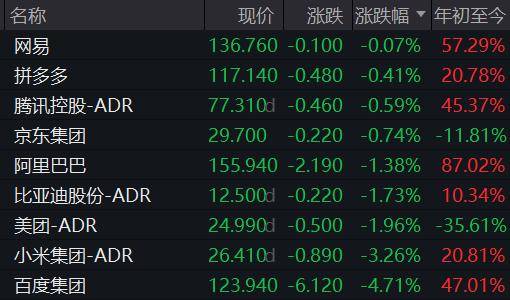 中概股表现疲软,纳斯达克中国金龙指数收跌1.37%,万得中概科技龙头指数跌1.12%。百度集团领跌,跌幅超4%,贝壳、信也科技跌近4%,小鹏汽车、理想汽车跌超3%。