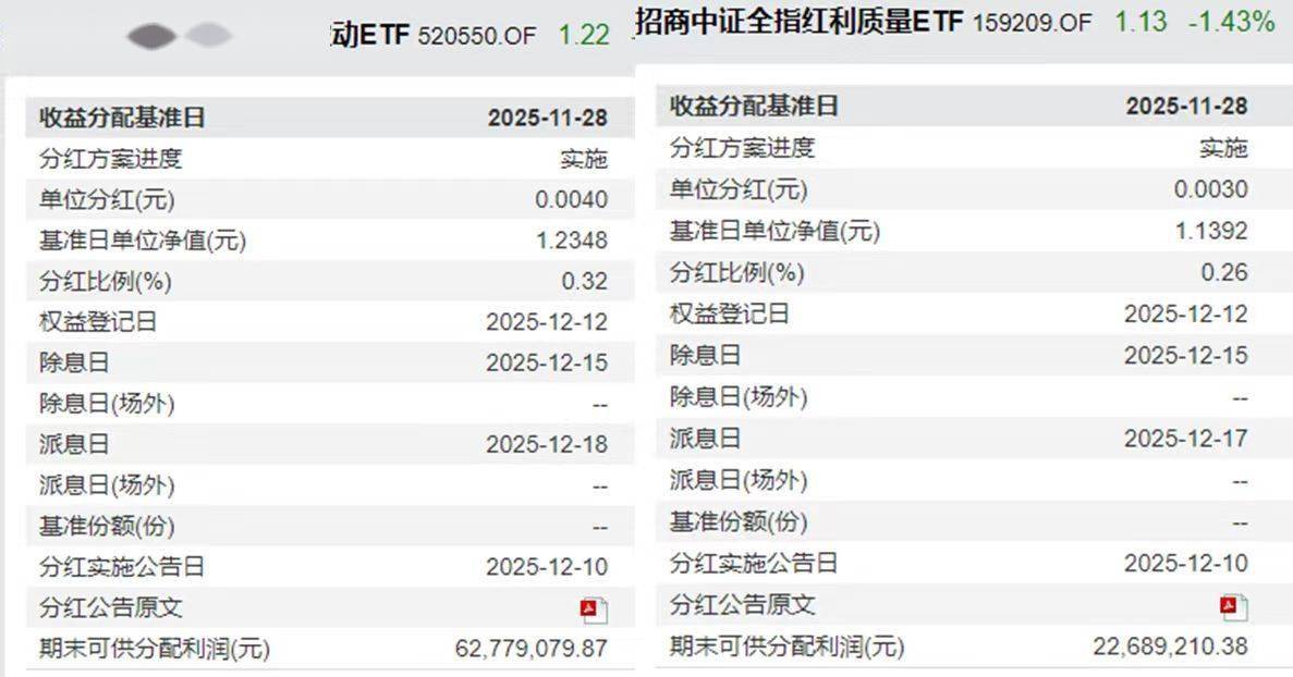 招商基金旗下两只特色红利策略ETF同步公告本月分红。其中,中证红利质量ETF(159209)迎来本年度第六次分红,每份派现0.003元,分红比例0.3%;港股红利低波ETF(520550)迎来年内第八次分红,每份派现0.004元,分红比例同为0.3%。