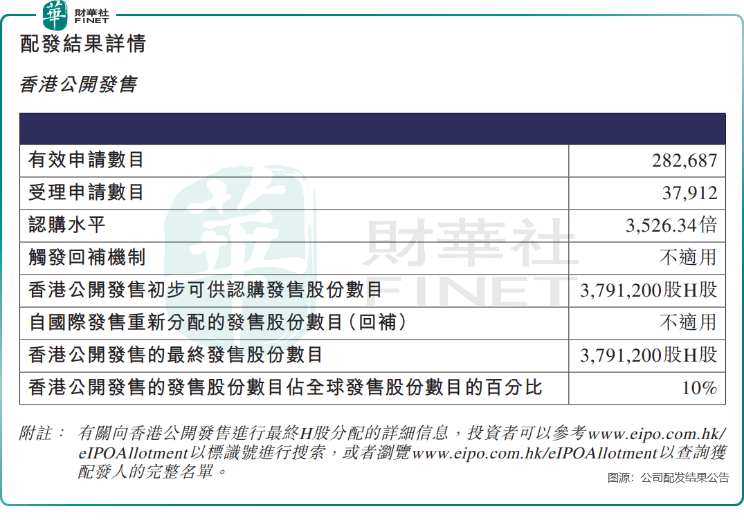 根据公司公布的配发结果,宝济药业此次全球发行3791.17万股H股。其中,面向散户的香港公开发售部分,获得了3526.34倍的惊人超额认购;面向机构投资者的国际发售部分也获得了6.59倍的认购。