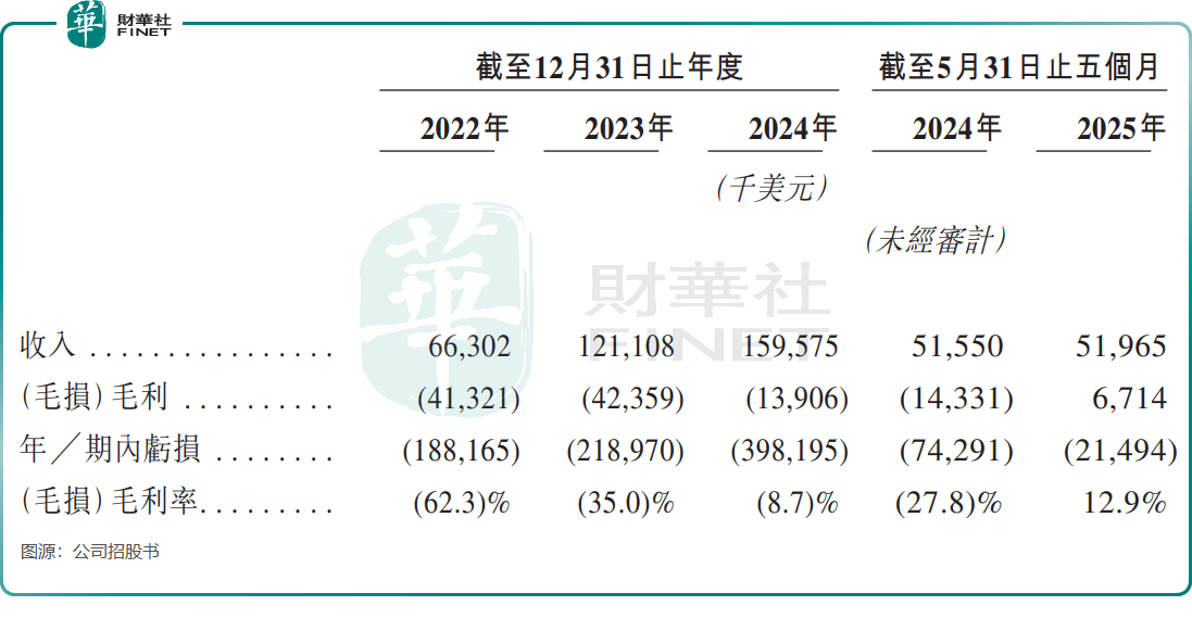 与已经强势扭亏为盈的禾赛相比,图达通和速腾聚创一样,仍深陷亏损泥潭。2022年至2024年,公司亏损额持续扩大,2025年前五月净亏损2149.4万美元。