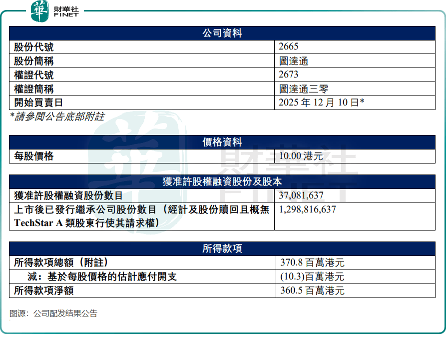 根据公司发布的配售结果公告,图达通获准许进行股权融资3708.16万股,上市后已发行继承公司股份数目(经计及股份赎回且概无TechStar A类股东行使其请求权)12.99亿股,每股价格10港元,所得款项净额为3.605亿港元。