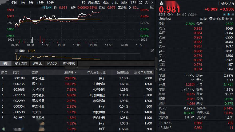 成份股方面,种子、养殖、水产等板块部分个股涨幅居前。截至发稿,神农种业20CM涨停,罗牛山亦涨停,天马科技大涨超7%,海南橡胶涨超5%,圣农发展、敦煌种业双双涨超2%。