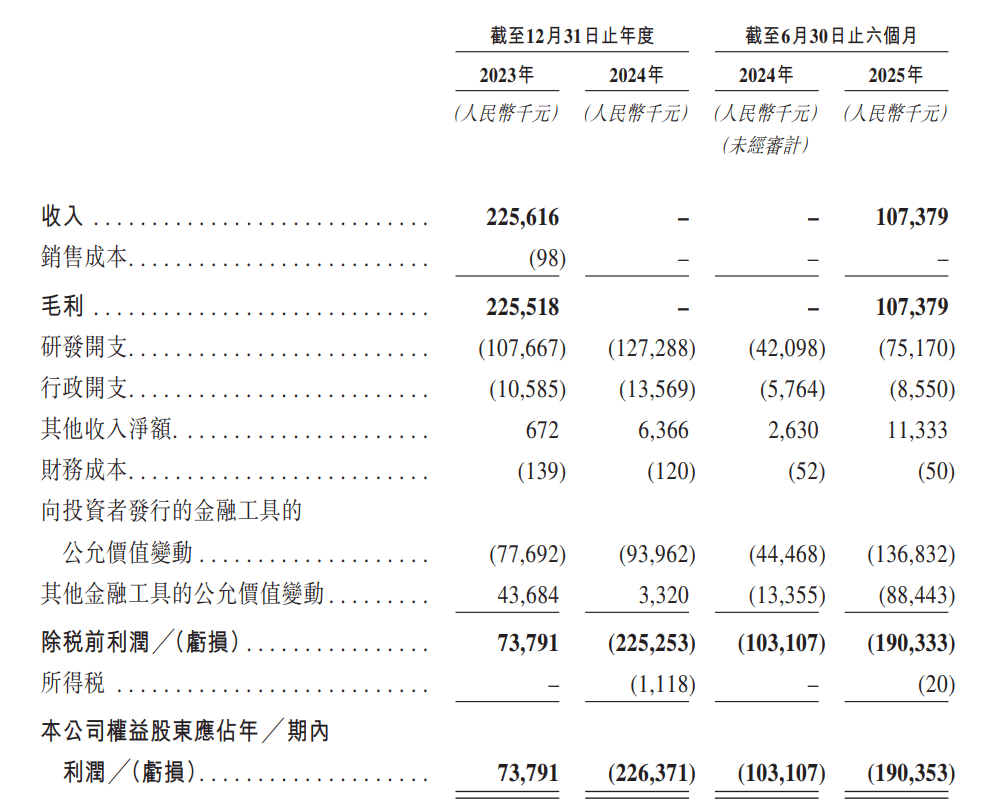 招股书显示,2023年-2025年上半年,该公司实现营收分别为2.26亿元、0元、1.07亿元,期内利润分别为7379万元、-2.26亿元、-1.9亿。但从中也可以发现,尽管没有商业化产品,高光制药仍有现金入账,而这主要系一笔重大的商业合作。