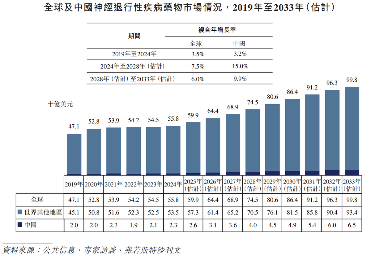 另外,2019-2024年,全球神经退行性疾病药物市场规模从471亿美元增至558亿美元;预计到2028年将达到745亿美元,到2033年将达到998亿美元。