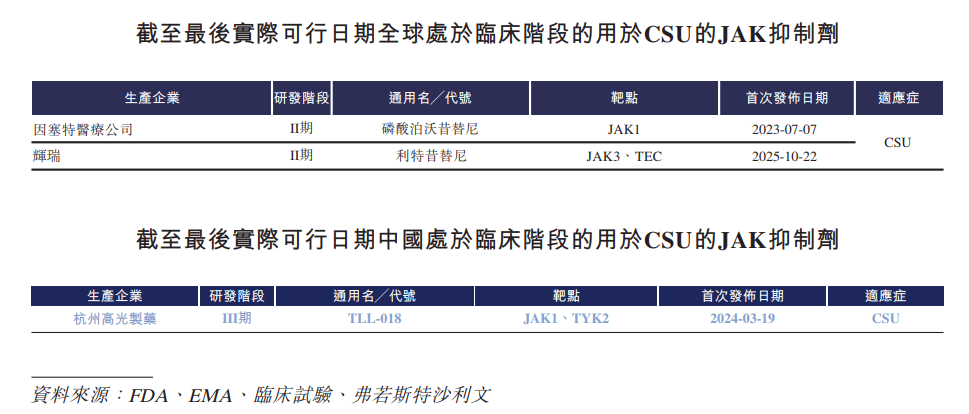 不过,在一些特定疾病领域,高光制药仍有树立差异化优势的空间。比如CSU。据了解,全球尚无JAK抑制剂获批用于治疗CSU,仅有三款用于治疗CSU的JAK抑制剂处于临床开发阶段,即因塞特医疗公司的磷酸泊沃昔替尼、辉瑞的利特昔替尼以及高光制药的TLL-018。