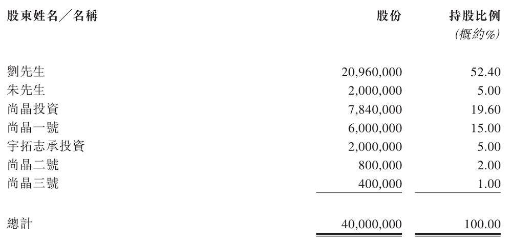 刘道国、吴映灵夫妇合计拥有尚鼎芯已发行股本总额约95.0%的权益,为该公司控股股东和实际控制人。包括刘道国直接持有的约52.40%的权益和间接控制的23%权益,以及尚晶投资(吴映灵为其唯一普通合伙人)间接持有的约19.60%的权益。