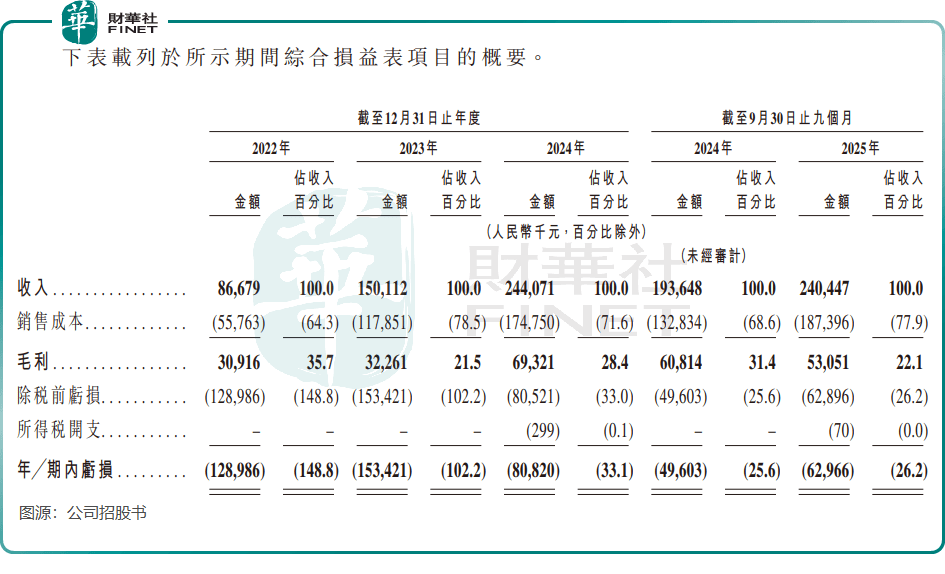 公司收入在报告期内经历了快速增长,从2022年的约0.87亿元增长至2024年的2.44亿元,增幅约为181.6%;2025年前九个月收入已达约2.4亿元,接近2024年全年水平。