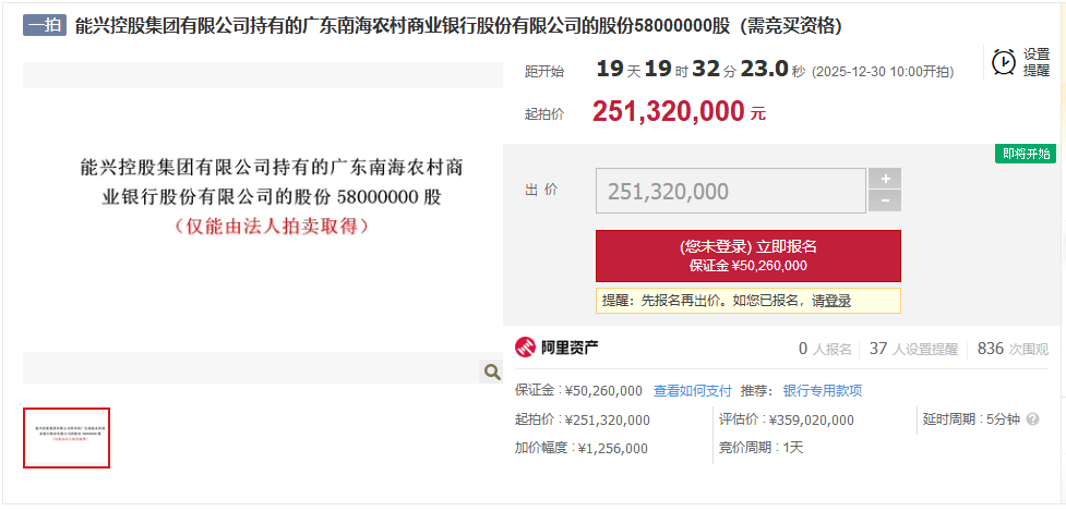 阿里资产司法拍卖平台信息显示,南海农商行第五大股东能兴控股集团有限公司(下称“能兴控股”)持有的6500万股法人股将于2025年12月30日公开拍卖,起拍价较估值折价30%。若拍卖成功,能兴控股将退出该行前十大股东名单。