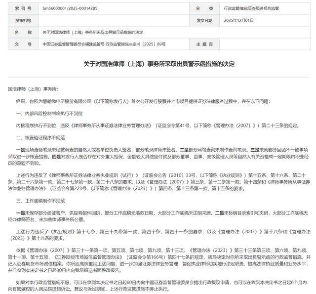 近日,福建证监局发布了一则行政监管措施决定书,剑指国浩律师(上海)事务所。