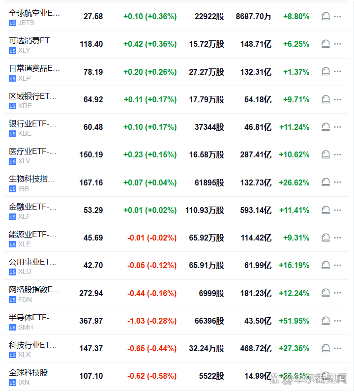 全球航空业ETF美股盘初涨0.36%,与可选消费ETF领跑行业ETF,网络股指数ETF跌0.16%,半导体ETF跌0.28%,科技行业ETF跌0.44%,全球科技股指数ETF跌0.56%。