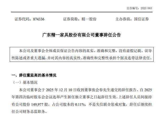 12月10日,精一股份(874336.NQ)发布公告,公司董事会于当日收到董事张会春、戴金龙递交的辞任报告。
