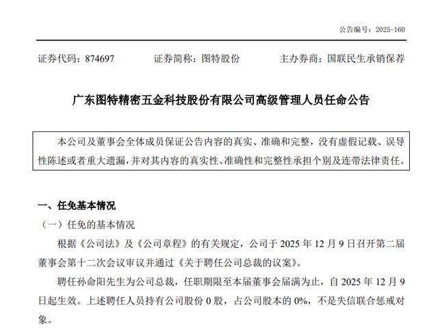 乐居财经 李兰12月11日,图特股份(874697.NQ)发布公告,聘任孙命阳为公司总裁,全面负责公司日常经营管理工作。