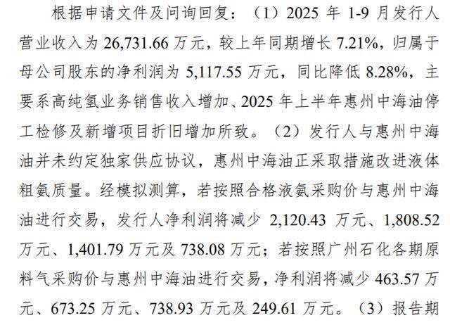根据申请文件及问询回复,2025年1-9月,华达通营业收入为26,731.66万元,较上年同期增长7.21%;归属于母公司股东的净利润为5,117.55万元,同比降低8.28%,主要系高纯氢业务销售收入增加、2025年上半年惠州中海油停工检修及新增项目折旧增加所致。