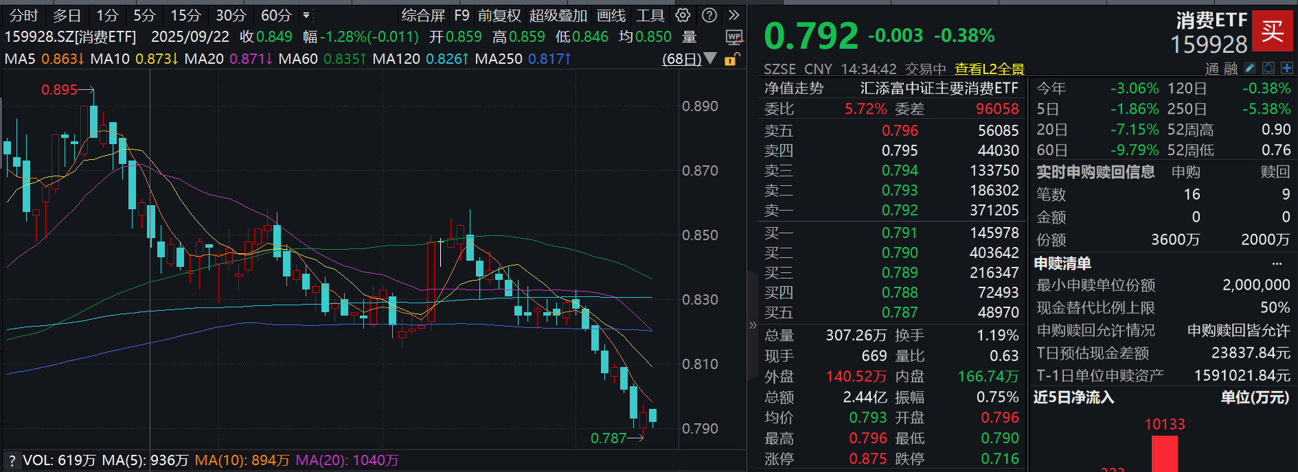 今日(12.11),A股大小指数分化,大消费小幅回调,消费ETF(159928)跌0.38%,盘中成交额超2.5亿元!资金面上,消费ETF(159928)盘中再获净流入1600万份!截至12月10日,消费ETF(159928)最新规模超205亿元,同类断层领先!