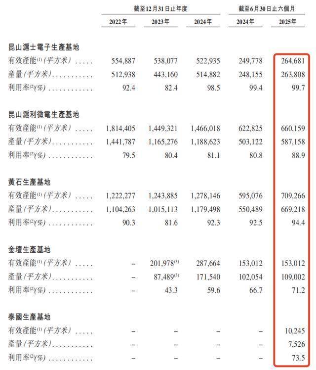 不过,从招股书披露的五大生产基地产能利用率来看,除昆山沪士电子生产基地和黄石基地的产能利用率在2025年上半年基本饱和外,其余生产基地的利用率均不及90%。