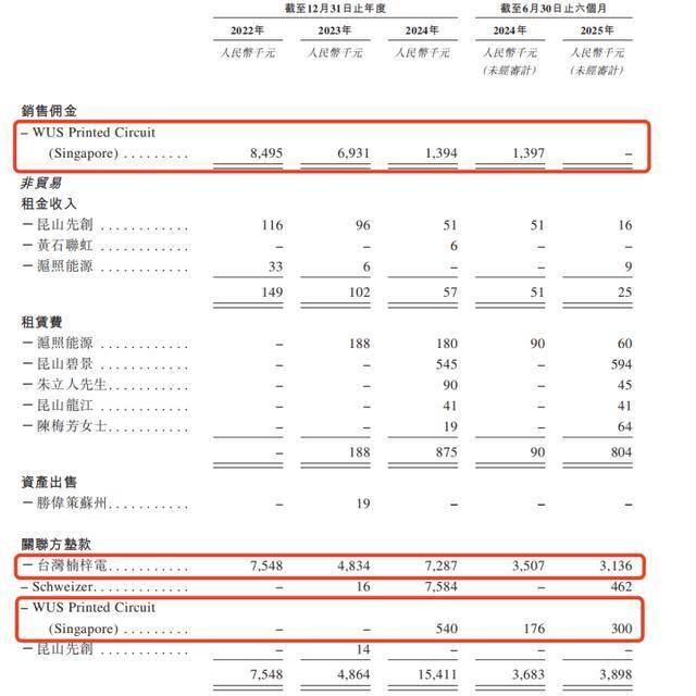 还需指出的是,沪电股份和台湾楠梓电之间还存在频繁的资金拆借和代垫款项。截至2025年6月末,沪电股份向台湾楠梓电和WUS Singapore的关联方垫款合计余额为343.6万元。