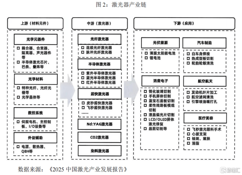 产业链下游则是以大族激光和华工激光为代表的激光加工设备商以及科研院所、高等院校、研究型企业等,最终应用于消费电子、半导体加工、航空航天、高端材料加工、科学研究、生物医疗等众多领域。