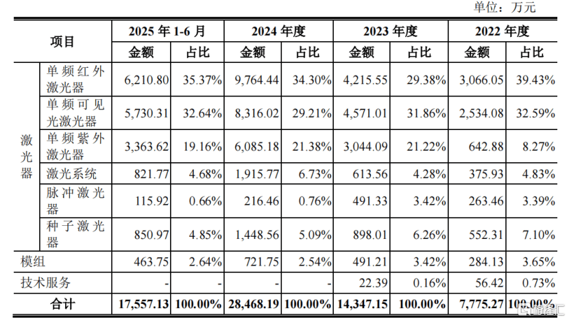 其中,单频红外激光器、单频可见光激光器、单频紫外激光器在2024年的收入占比分别为34.3%、29.21%、21.38%。