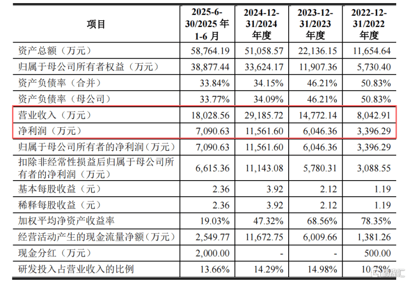2022年、2023年、2024年及2025年1-6月(报告期),公司营业收入分别为8042.91万元、1.48亿元、2.92亿元和1.8亿元,2022年至2024年复合增长率为90.49%,公司营业收入有所提高,但目前整体规模仍相对较小,抵御风险能力相对较弱。