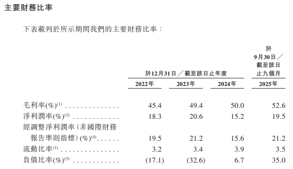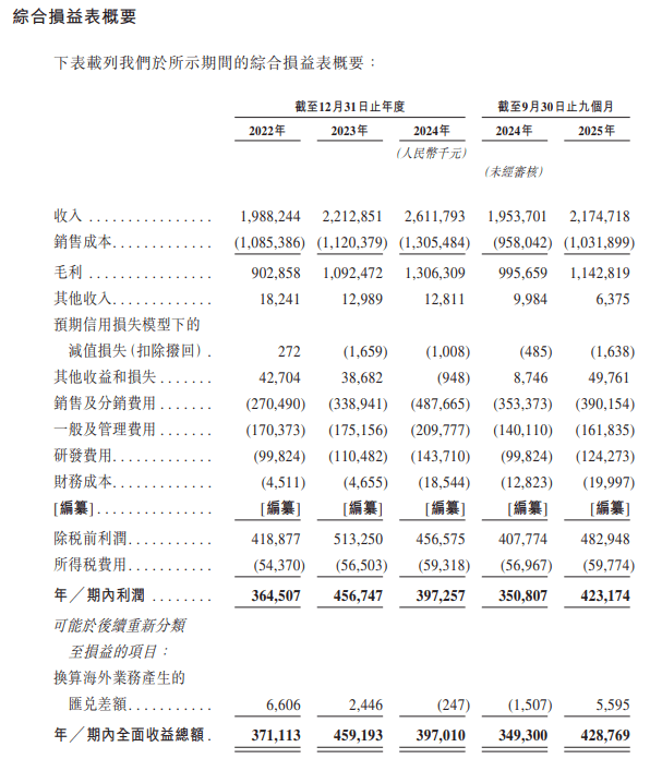 财务数据方面,2022年至2024年,飞速创新收入分别为19.88亿元、22.13亿元、26.12亿元,年内利润分别为3.65亿元、4.57亿元及3.97亿元,毛利率分别为45.4%、49.4%、50%。2025年前9个月,飞速创新营收为21.75亿元,较上年同期的19.54亿元增长11.3%;毛利为11.43亿元,上年同期的毛利为9.96亿元;期内利润为4.23亿元,上年同期的期内利润为3.51亿元。