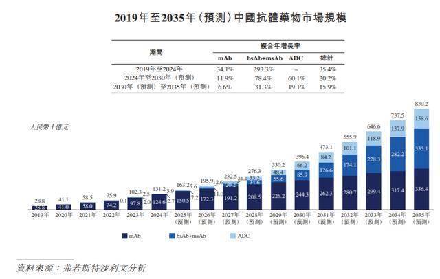 中国抗体药物市场规模从2019年的人民币288亿元迅速增长至2024年的人民币1,312亿元,复合年增长率为35.4%。未来十年,随着更多抗体药物纳入国家医保药品目录、生物类似药的可及性提高以及创新抗体产品的上市,中国抗体药物市场预计将从2024年的人民币1,312亿元增长至2030年的人民币3,964亿元,复合年增长率为20.2%,并进一步增至2035年的人民币8,302亿元,2030年至2035年的复合年增长率为15.9%。按产品类型划分,单克隆抗体预计仍将是最大的细分市场,而双特异性及多特异性抗体和ADC均预计录得更快增长。特别是,中国的ADC市场预计将从2024年的人民币39亿元显著扩大至2030年的人民币662亿元及2035年的人民币1,586亿元,2024年至2030年的复合年增长率为60.1%,2030年至2035年的复合年增长率为19.1%。下图载列2019年至2035年中国抗体药物市场的历史及预测规模。