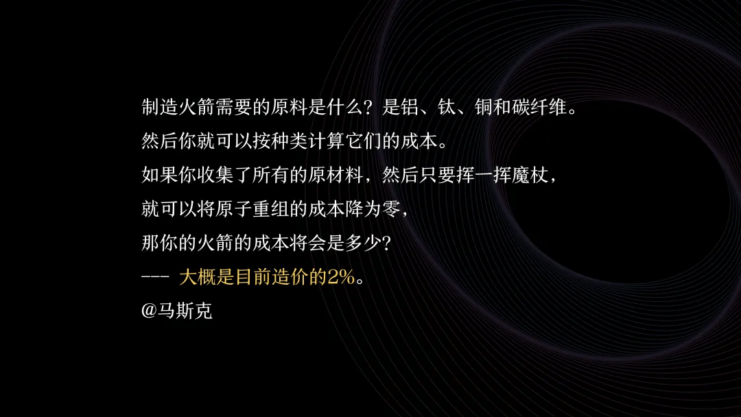 他将零部件拆解到原子层面,发现原材料成本仅为造价的2%,白痴指数高达50倍,意味着可优化空间巨大。因此,他将成本控制在竞争对手的十分之一甚至四十分之一,实现十倍速降低成本,推动架构性变革。