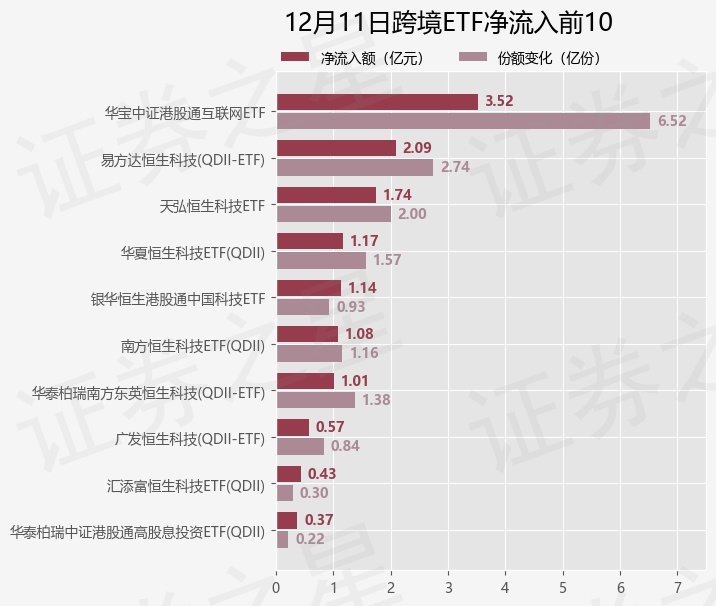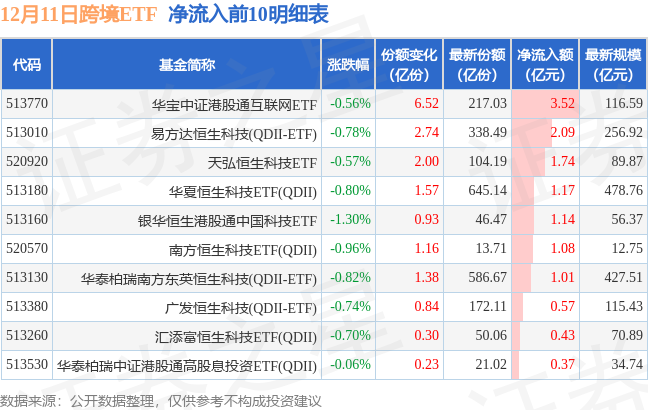 当日有46只跨境ETF基金出现资金净流入,其中净流入排首位的是华宝中证港股通互联网ETF(513770),份额增加了6.52亿份,净流入额为3.52亿元。
