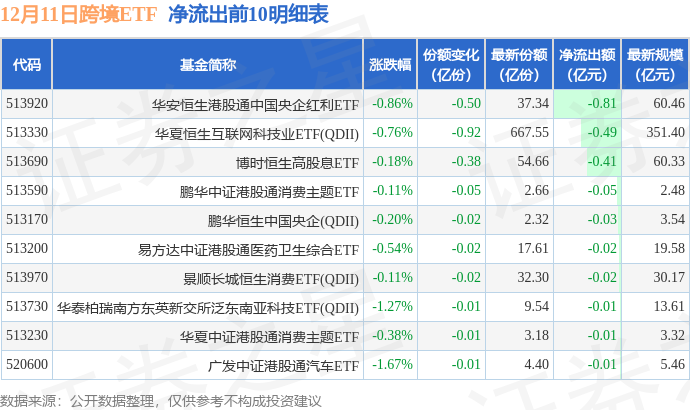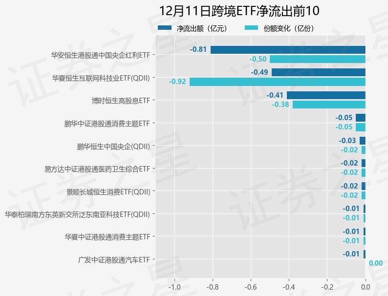 当日有10只跨境ETF基金出现资金净流出,其中净流出排首位的是华安恒生港股通中国央企红利ETF(513920),份额减少了5000.0万份,净流出额为8084.39万元。