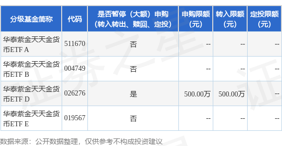 注:为维护基金份额持有人的利益,华泰证券(上海)资产管理有限公司(以下简称“本公司”)决定自2025年12月15日起单日每个基金账户累计申购华泰紫金天天金货币ETF D类份额的合计金额不得超过人民币500万元。若超过上述金额,本基金管理人有权部分或全部拒绝该笔申购申请。本基金限制大额申购业务期间,本公司将正常办理本基金的赎回业务。本基金恢复办理大额申购业务的具体时间将另行公告。