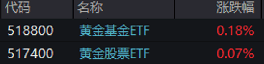 12月11日黄金基金ETF(518800)收涨0.18%,黄金股票ETF(517400)收涨0.07%。