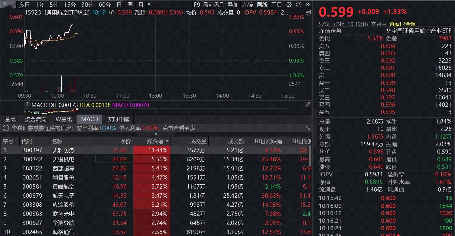 12月12日早盘,航空航天+低空经济携手冲高,天和防务涨超11%,天银机电、西部超导涨超5%,利君股份涨超4%,晨曦航空、航天电子、应流股份涨超3%。一键布局低空经+大飞机+军民融合+商业航天的通用航空ETF华宝(159231)场内价格现涨1.53%,冲击周线三连阳。