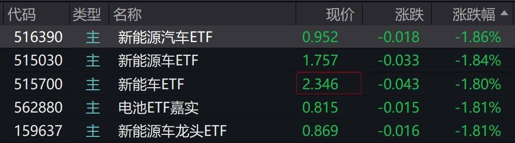 受盘面影响,新能源汽车相关ETF跌近2%。