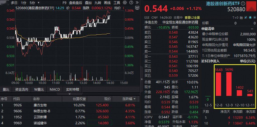 12月12日午后,港股通创新药板块回暖,高弹性港股通创新药ETF(520880)翻红后持续拉升,1%,今日有望终结日线4连阴形态。值得关注的是,本周520880迎来“抄底”资金增仓,累计净申购额1.3亿元