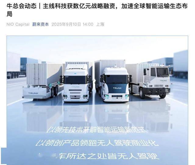 今年9月,据蔚来资本披露,主线科技宣布获得数亿元战略融资。本轮融资将助力主线科技持续巩固在无人驾驶领域的技术领先与商业化领跑优势,并加速全球业务落地。