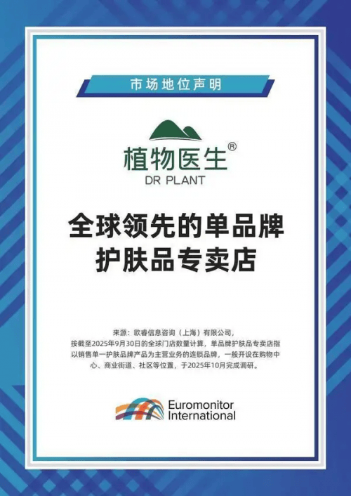 如今,其海外版图已持续扩张,2025年11月22日泰国曼谷旗舰店的开业,标志着品牌正式进驻第四个海外国家,门店网络覆盖中国内地、中国香港、日本、印尼、泰国等多个国家和地区。截至2025年9月,全球单品牌店数量已突破4000家,服务超3000万会员;同年11月,更获评欧睿咨询认证的“全球领先的单品牌护肤品专卖店”,这是继2023年、2024年连续认证后,品牌在单品牌店赛道再次获得国际权威认可。此外,按2024年度全渠道零售额计算,植物医生位列中国单品牌化妆品店第一名,2022-2023年蝉联CCFA“生活服务业连锁企业TOP100”美容美体行业第二名,渠道硬实力与品牌影响力持续领跑行业。