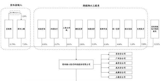 截止递表,核心医疗由余顺周直接持有21.79%,深圳心辅持有7.35%,余顺周为深圳心辅执行事务合伙人,因此,余顺周为核心医疗实控人,控股比例29.14%。