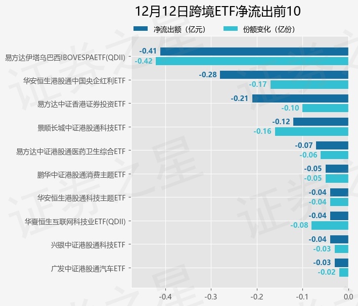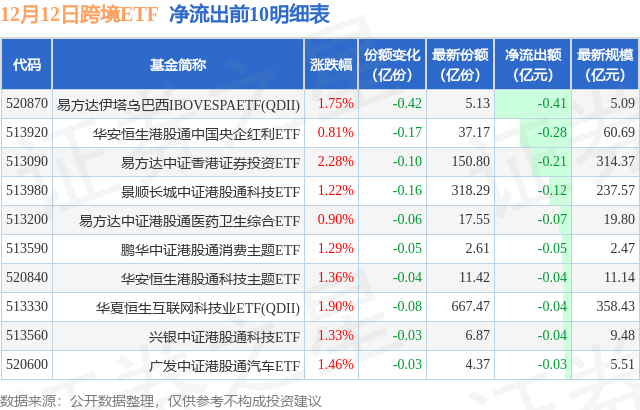 当日有18只跨境ETF基金出现资金净流出,其中净流出排首位的是易方达伊塔乌巴西IBOVESPAETF(QDII)(520870),份额减少了4200.0万份,净流出额为4140.77万元。